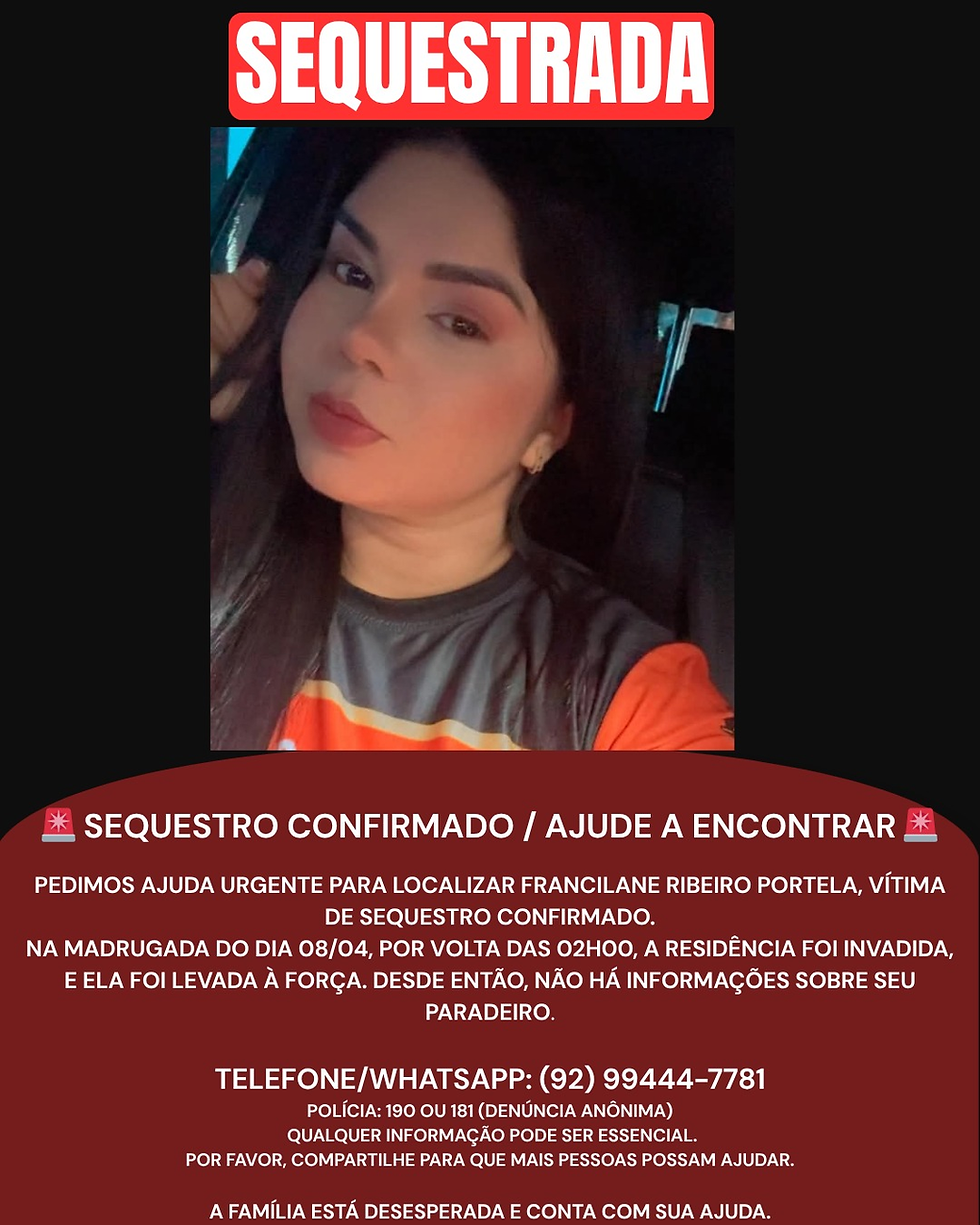 Uma mulher identificada como Francilane Ribeiro Portela, foi sequestrada após um assalto ocorrido em sua residência, localizada na Rua São Paulo, bairro Cidade de Deus, zona norte de Manaus, na madrugada desta quarta-feira (8).