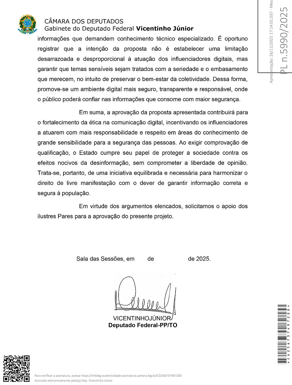 Os influenciadores sem formação acadêmica, certificação técnica ou habilitação profissional compatível podem ter a atuação limitada na internet. Isso pode acontecer caso um Projeto de Lei apresentado pelo deputado Vicentinho Júnior (PP-TO) avance na Congresso Nacional.